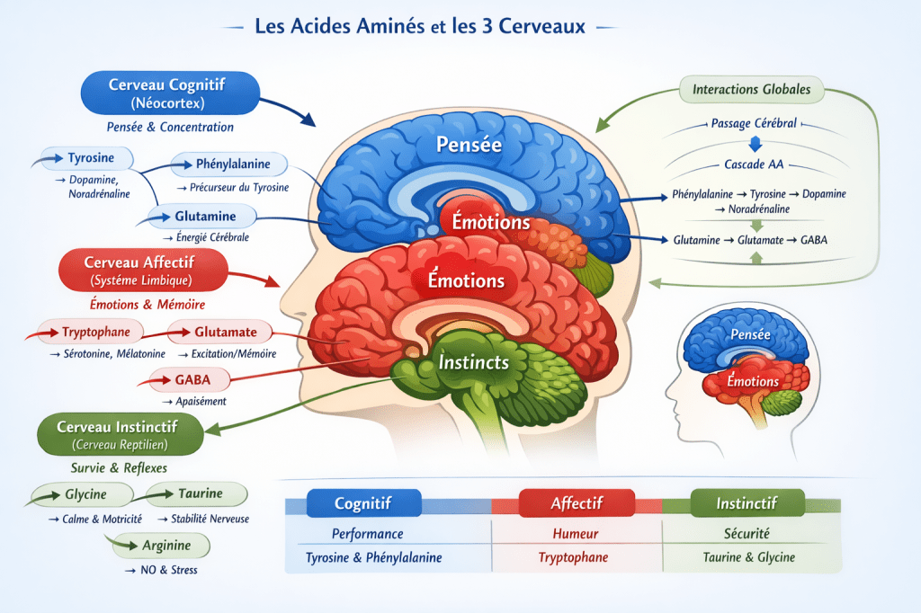 Ces actifs n’agissent pas isolément. Leur interaction conditionne l’équilibre du système nerveux, notamment dans les phases de stress, de fatigue ou de désadaptation.